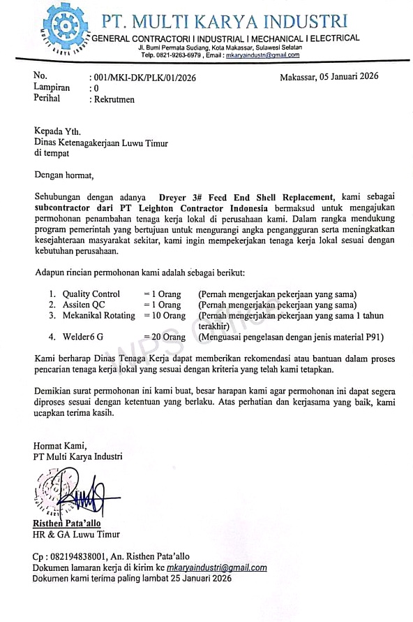 LOWONGAN PEKERJAAN PT. Leighton yang bergerak dibidang konstruksi, civil dan maintenance membutuhkan tenaga-tenaga yang handal untuk mengisi posisi sbb: 1. Welder 3G (5) 2. Welder 6G (5) 3. MECHANICAL FITTER I (12) 4. DRIVER BUS (2) 5. SECURITY (1) 6. MECHANIC (1) 7. SANBLASTER/PAINTER (1) 8. MATERIAL CONTROL (1) Tautan Ekternal: KLIK DISINI PERSYARATAN UMUM: 1. Kartu Kuning dari Disnaker 2. Lulusan Min. SLTA/SMU 3. Umur Max. 45 Tahun 4. KTP LUTIM 5. Memiliki pengalaman Minimal 2 (Dua) tahun di bidang masing-masing), untuk: Driver bus diutamakan memiliki SIMPER PT.VALE Untuk Security memiliki certificate sebagai security Diutamakan yang memiliki certificate welder dari PT.Vale 6. Tidak sedang terikat kontrak dengan perusahan lain. Tautan Ekternal: KLIK DISINI Silahkan kirim lamaran anda dengan dengan melampirkan: 1. Fotocopy Ijazah Terakhir yang sudah dilegalisir 2. Fotocopy KTP& Kartu keluarga 3. Fotocopy Kartu BPJS TK & Kesehatan (jika Ada) 4. SKCK & NPWP 5. Foto Ukuran ...